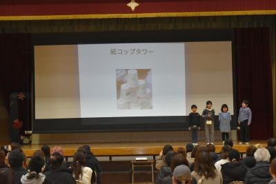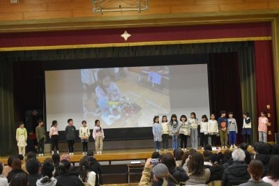 2月12日(木)3.4時間目体育館で2年生の学習発表会を行いました。「ようこそおもちゃフェス」では、まわすグループやとばすグループなどに分かれて、どんなおもちゃを作成したか、どのように遊ぶのかを説明しました。最後はグループに分かれてお家の方々と一緒に楽しく遊びました。