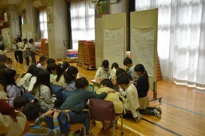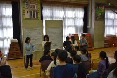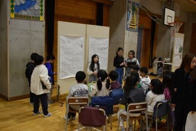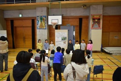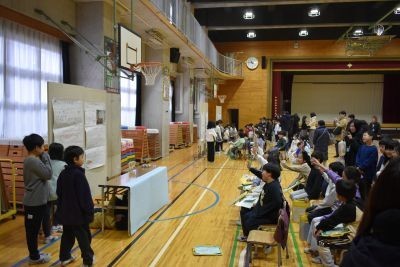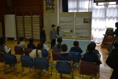 2月13日(金)3.4時間目体育館で3年生の学習発表会を行いました。「Biotope de try!」では、6グループに分かれて、1年間取り組んできたビオトープでの生体調査について報告しました。ポスターセッション形式の中に、ペープサートやクイズも取り入れて、分かりやすく、楽しく発表することができました。
