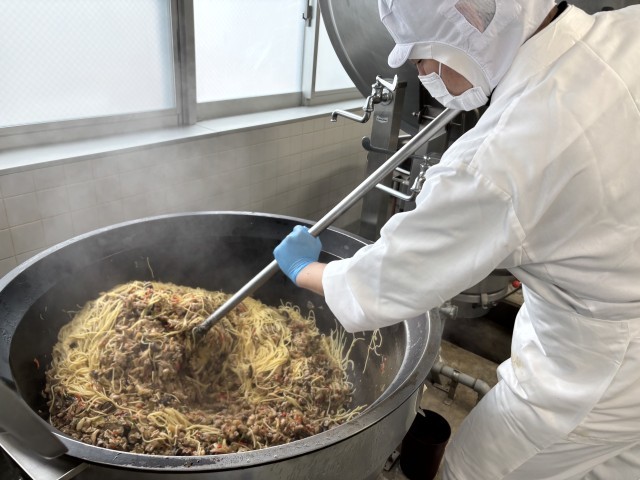 和風しょうゆスパゲッティは、ナス、いか、しめじ、豚肉などのほかにピーマンや赤ピーマンを使い、彩りよく仕上げました。しょうゆをベースとした味付けに、仕上げにバターを入れることでコクを出しました。