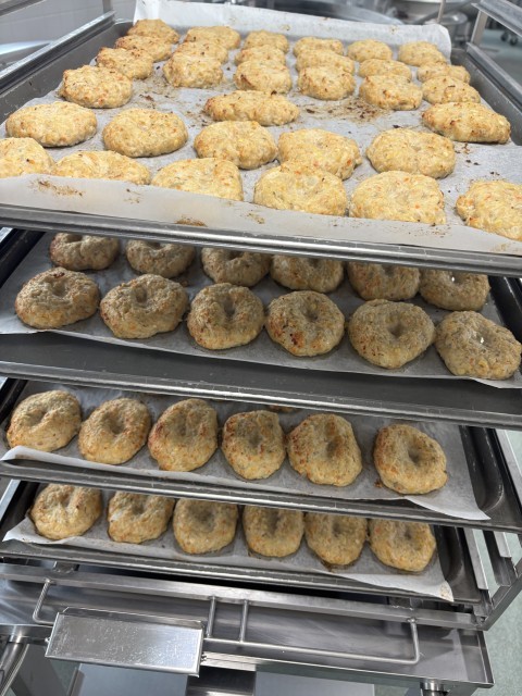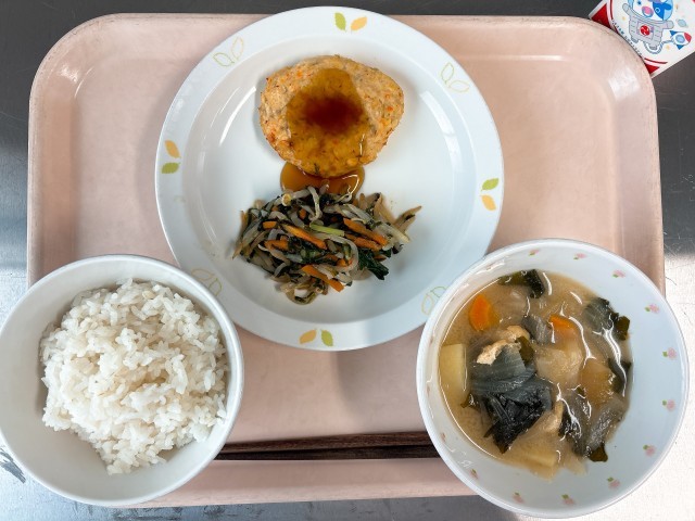 鶏と野菜のつくね焼きは、鶏ひき肉にたまねぎ、ねんじん、ごぼうなどを混ぜ合わせて小判型に丸めて焼きあげました。豆腐を加えることでより柔らかい食感に仕上げています。