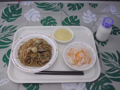 11月27日(火)メニューは、五目焼きそば、大根の甘辛漬、マーラーカオ、牛乳です。