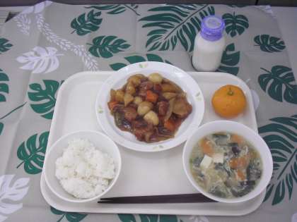12月11日(火)メニューは、ごはん、酢豚、にらたまスープ、みかん、牛乳です。
