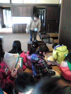 クラスごとに、古民家の中を見学しました。職員の方に、昔のくらしや道具などについてくわしく説明していただきました。