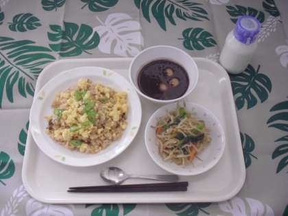 1月15日(火)メニューは、そぼろごはん、ごまあえ、白玉しるこ、牛乳です。