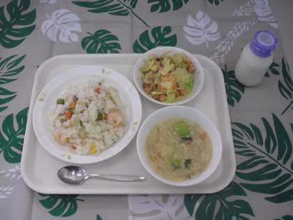 2月5日(火)メニューは、三色ピラフ、チーズのふわふわスープ、シーザーサラダ、牛乳です。