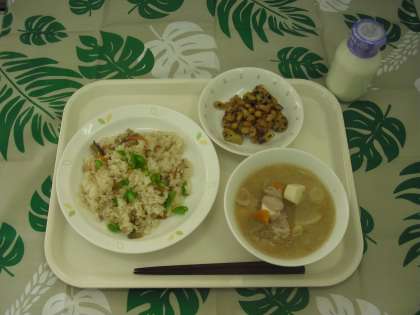 2月4日(月)五目ごはん、豚汁、豆かりんとう、牛乳です。