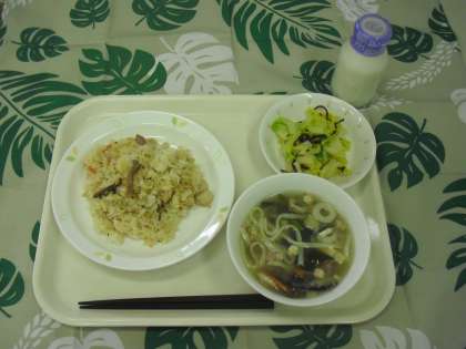 2月12日(火)メニューは、山菜おこわ、あんかけ汁、白菜の塩昆布かけ、牛乳です。