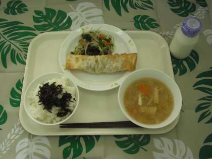 2月21日(木)メニューは、ごはん、ひじきふりかけ、棒ぎょうざ、もやしの和風サラダ、牛乳です。