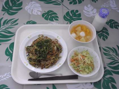 3月12日(火)メニューは、ソース焼きそば、わかめスープ、白菜の中華サラダ、フルーツ白玉、牛乳です。