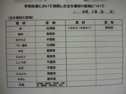 メニュー:ごはん・マーボ豆腐・ナムル・くだもの・牛乳