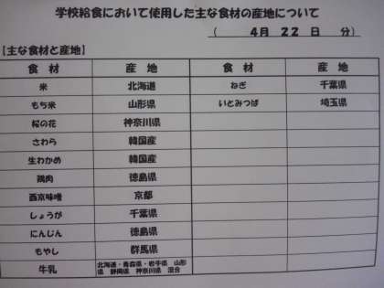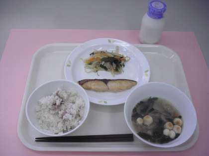 メニュー:さくらの花のごはん・魚の西京焼き・和風サラダ・よしの汁・牛乳