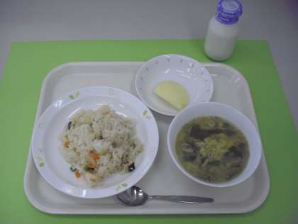 メニュー:チャーハン・たまごとわかめのスープ・くだもの・牛乳