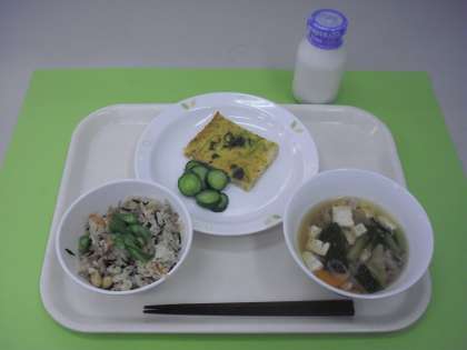 メニュー:豆入りひじきごはん・豆腐汁・たまご焼き・きゅうりのひとしお・牛乳