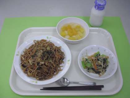 メニュー:ソース焼きそば・ナムル・フルーツ白玉・牛乳