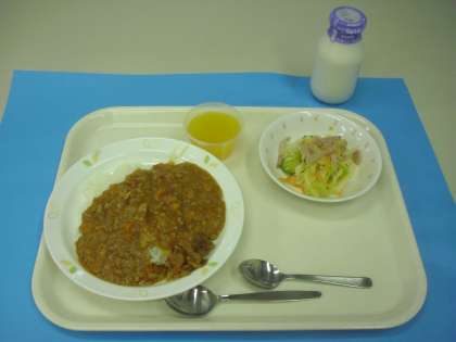 メニュー:キーマカレーライス、イタリアンサラダ、みかんゼリー、牛乳
