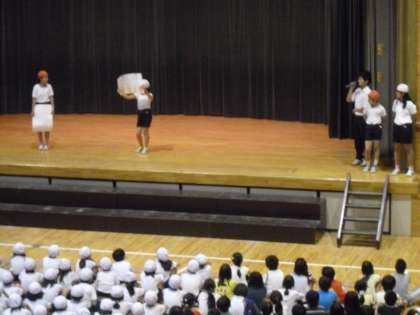 来週から水泳指導が始まります。本日は、体育委員会による劇を見て、持ち物や注意事項の確認をしました。