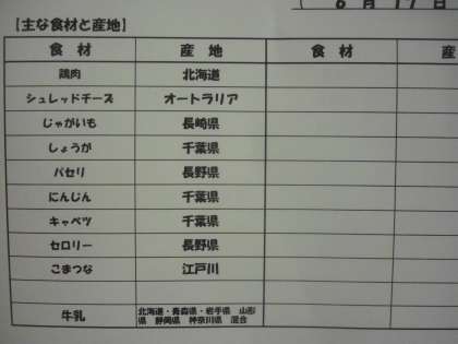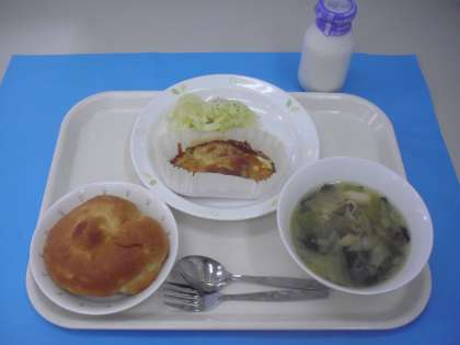 メニュー:パインパン、鶏肉のチーズ焼き、パセリポテト、野菜スープ、牛乳