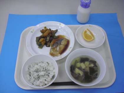 メニュー:わかめとじゃこのごはん、鰆の梅肉焼き、すまし汁、くだもの、牛乳