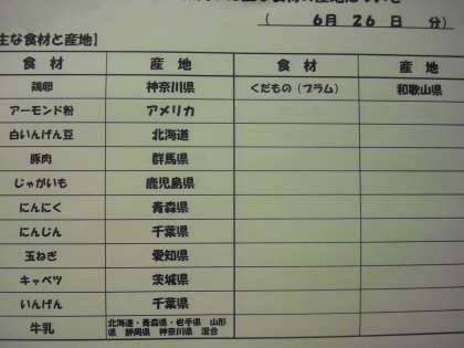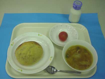 メニュー:ビスキュイパン、白いんげんの田舎風スープ、くだもの、牛乳