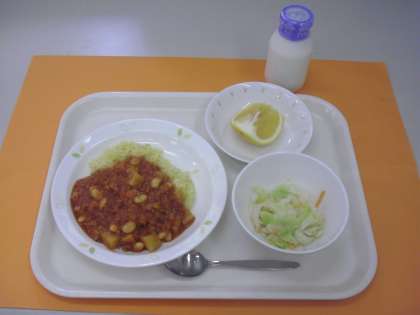 メニュー:チリビーンズライス、キャベツサラダ、くだもの、牛乳