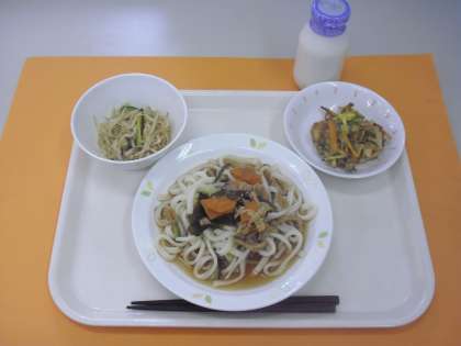 メニュー:五目冷やしうどん、かき揚げ、ごま酢がけ、牛乳