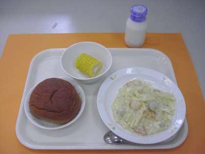メニュー:黒砂糖パン、マカロニのホワイトソース、蒸しとうもろこし、牛乳