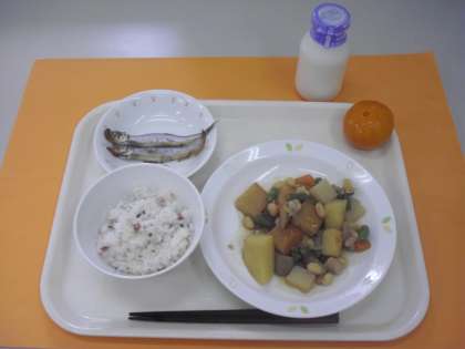 メニュー:うめわかめごはん、豆入り筑前煮、焼きししゃも、くだもの、牛乳