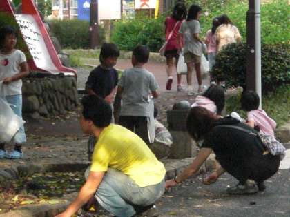 ラジオ体操終了後は、烏山川緑道や学校の周りの清掃活動を行いました。