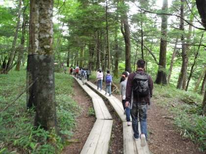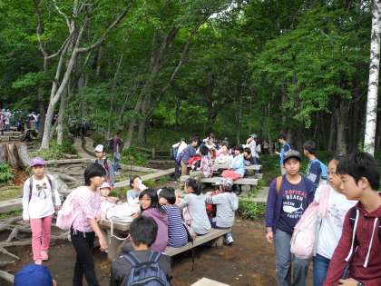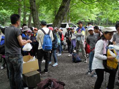 湯滝でお弁当を受け取り、ハイキングにスタートです。熊の目撃情報が多いので、オリエンテーリングはあらめて、班ごとにまとまりながら歩きました。途中の休憩場所でもらったアメがおいしかったです。