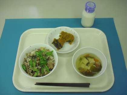 豆入りひじきごはん、すまし汁、かぼちゃのふくめ煮、牛乳