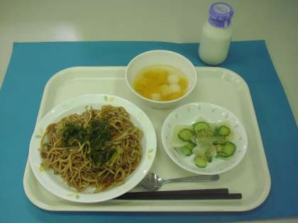 ソース焼きそば、きゅうりと大根のごま風味、フルーツ白玉、牛乳