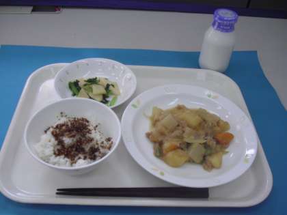 ごはん、かつおでんぶ、肉じゃがうま煮、かぶのレモンじょうゆがけ、牛乳