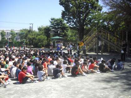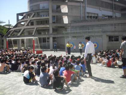 火事を想定した避難訓練を行いました。終了後、消火器の取り扱いについて指導を受けました。