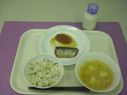 菜めし、魚の塩焼き、おろし大根、みそ汁、牛乳