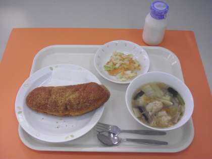 あげパン、白菜と肉団子のスープ、キャベツのサラダ、牛乳