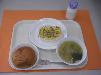 黒砂糖パン。フレンチエッグ、白菜スープ、牛乳