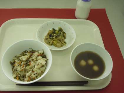 ぶたにくとごぼうのまぜごはん、きのこいりにびたし、しらたまじるこ、牛乳