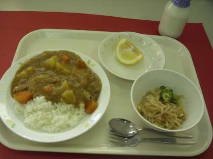 チキンカレーライス、ごまずかけ、くだもの、牛乳