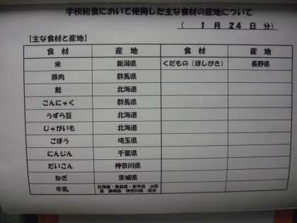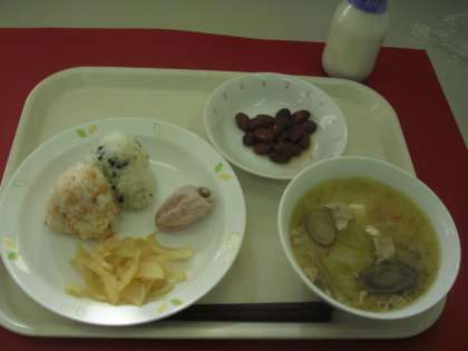 おにぎり、とんじる、にまめ、たくあん、牛乳