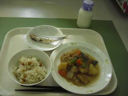 豆ごはん、いわしのまるぼし、ちくぜんに、牛乳