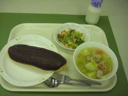 エクレアパン、ポトフ、わかめサラダ、牛乳
