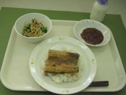 さかなのかばやきどん、野菜のからしじょうゆかけ、にまめ、牛乳