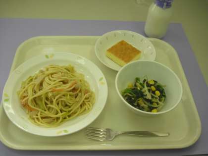 キャベツとツナのスパゲティ、ほうれんそうサラダ、チーズケーキ、牛乳