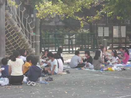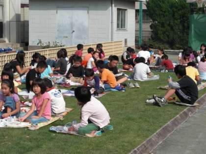 芝生の上やイチョウの木の下で1年生から6年生までが