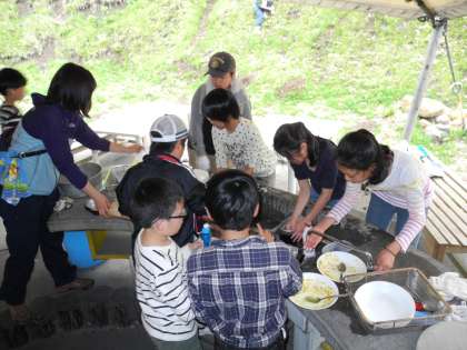 飯ごう炊さんをしました。今日の夕食だから、とても大事です。補助員さんの説明をよく聞いて、作業開始。じっくり煮込んで無事おいしいカレーライスができました。片付けもしっかりと行いました。