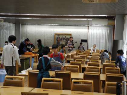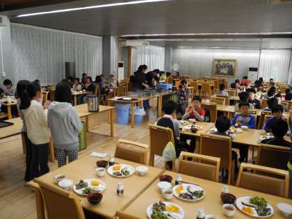 2日目の朝です。雲の切れ間から青空が見えています。少し肌寒いですが、さわやかな朝です。朝会で体操をしたあと、食事係は朝食の準備をしました。