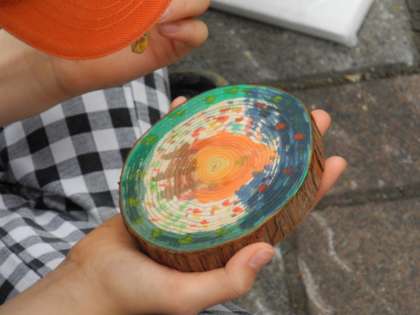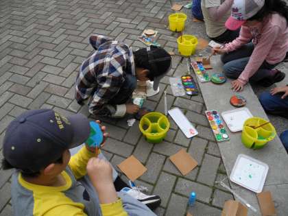 まず表面にやすりをかけすべすべにしてから、絵の具で絵を描きました。