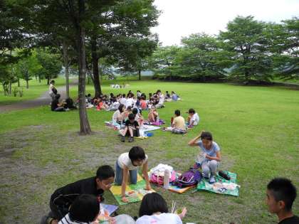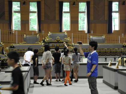 だいや川公園で昼食をとりました。ちょっと蒸し暑いですが、日が陰ってきたら、涼しい風が吹いてきました。その後、だいや川博物館に行って、日光東照宮の模型を見ました。今は工事中の陽明門を見ることができました。