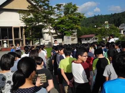 宿の近くの広い駐車場で、朝会をしました。ラジオ体操で体を目覚めさせ、田中先生の話を聞きました。みんな、寝られなかったと言う割には、元気です。