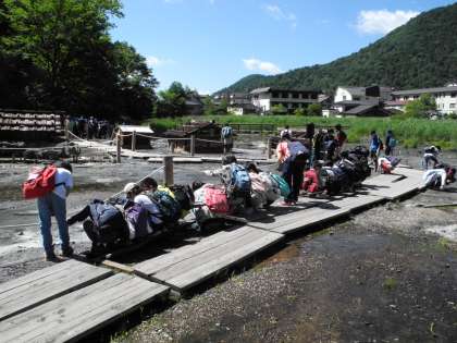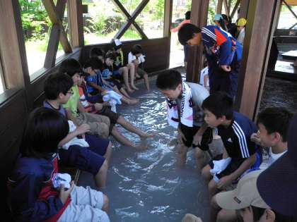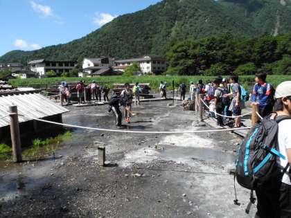 湯の湖の奥にある源泉に着きました。みんな10円を浸して変化を楽しみました。硫黄のにおいがすごかったです。近くの足湯によって、ちょっとひといき。ハイキング前なのに、くつろいでしまいました。